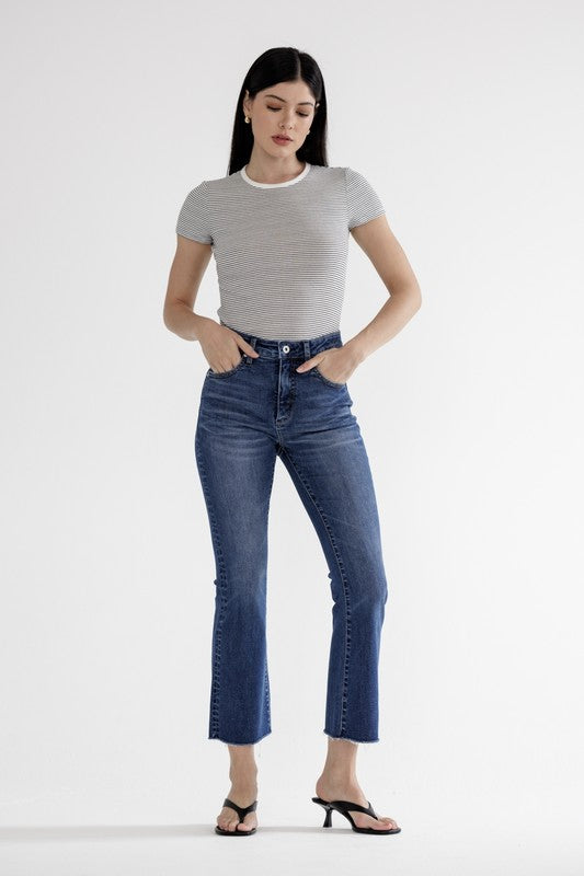 Introducing the Mica High Rise Cropped Bootcut Jeans in Astros Navy! Strut your stuff in these cropped high rise jeans that will elongate your legs and give you a trendy boot cut silhouette. Perfect for any casual or dressy occasion, these jeans are a must-have addition to your wardrobe.