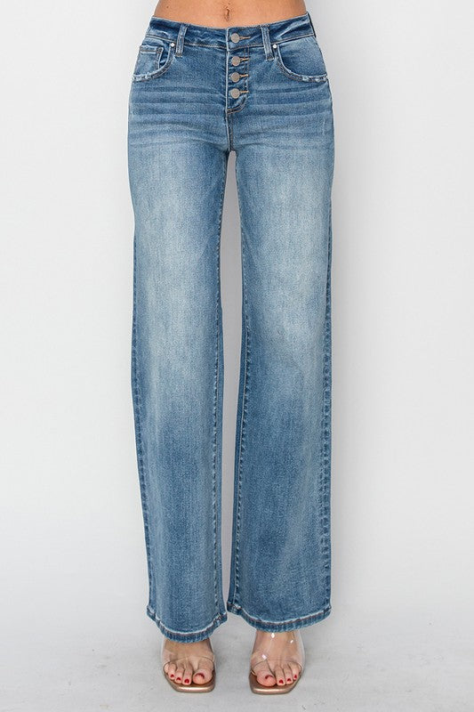 Risen Always Running Mid-Rise Button Down Wide Leg Jeans