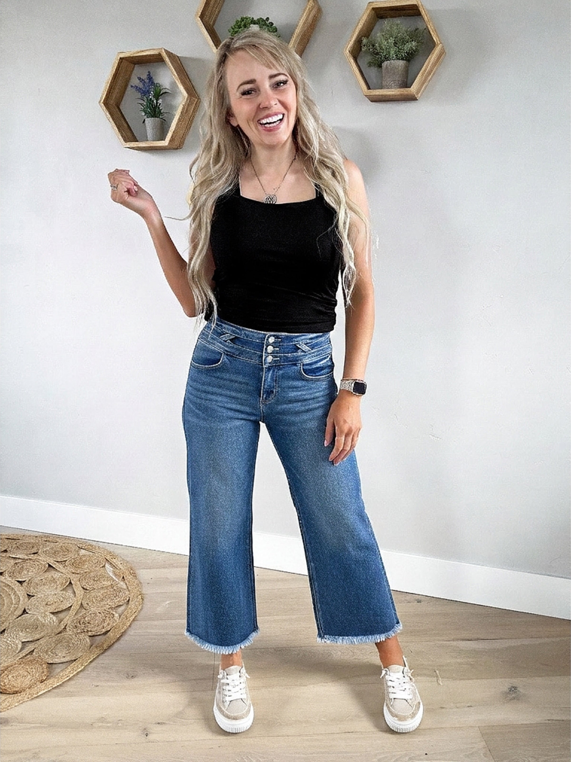 Step up your denim game with these show-stopping high-rise cropped jeans that refuse to blend in. The wide-leg cut gives you that effortless cool-girl vibe, while the eye-catching detailed waistband steals the spotlight. Whether you're dressing them up or keeping it casual, these jeans are your new go-to for looking put-together without trying too hard. Classic meets contemporary in the best way possible.