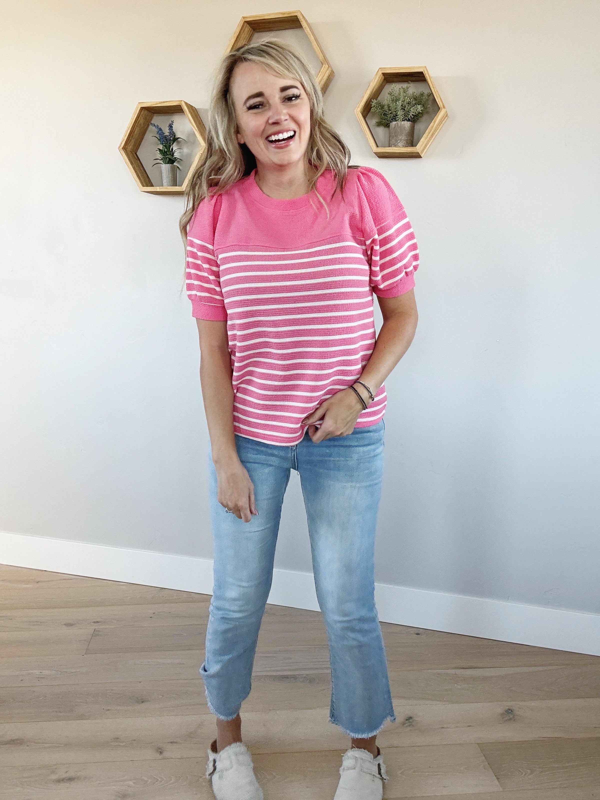 Girly Girl Striped Puff Sleeve Top In Pinkberry